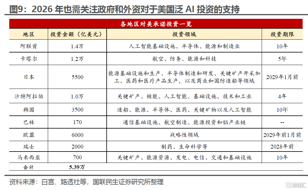 除此之外,过去1年特朗普在全球范围内大力“招商引资”。根据我们的不完全统计,主要经济体承诺对美投资的体量超过5万亿美元,落地期限在4至10年。如果能兑现,年均超过5000亿的投资可以给予GDP体量不到30万亿的美国超过1个百分点的拉动,也十分可观。
