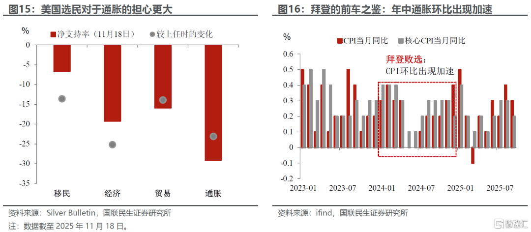 “民生”VS “通胀”:若更加激进地增加居民获得感、或者推进宽松,三季度有可能出现通胀环比回升。我们认为,明年上半年有税收返还的额外“红包”,特朗普如果要给居民“发钱”,最好的时间窗口其实在二季度末至第三季度。另外如果新主席上任后,在6月新官上任三把火,先行激进降息50bp,这些既能成为特朗普拉票的“噱头”,但也会导致通胀环比加速,因此紧跟民意动向、找到平衡很重要。