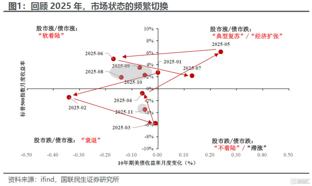 1月,美国“例外论”开始遭受质疑;2-4月,在美国财政紧缩论、关税担忧以及经济数据表现不佳的影响下,市场急转直下、进入类衰退的模式;5-7月,随着“TACO”交易的兴起,且经济数据在关税冲击后反弹,风险资产显著回暖;8-10月,就业市场偏软以及货币政策宽松的影响下,软着陆逐步成为共识;11月,联储有所转鹰以及AI逻辑被市场质疑,美股再度调整,市场一度跌出了衰退/恐慌的感觉。