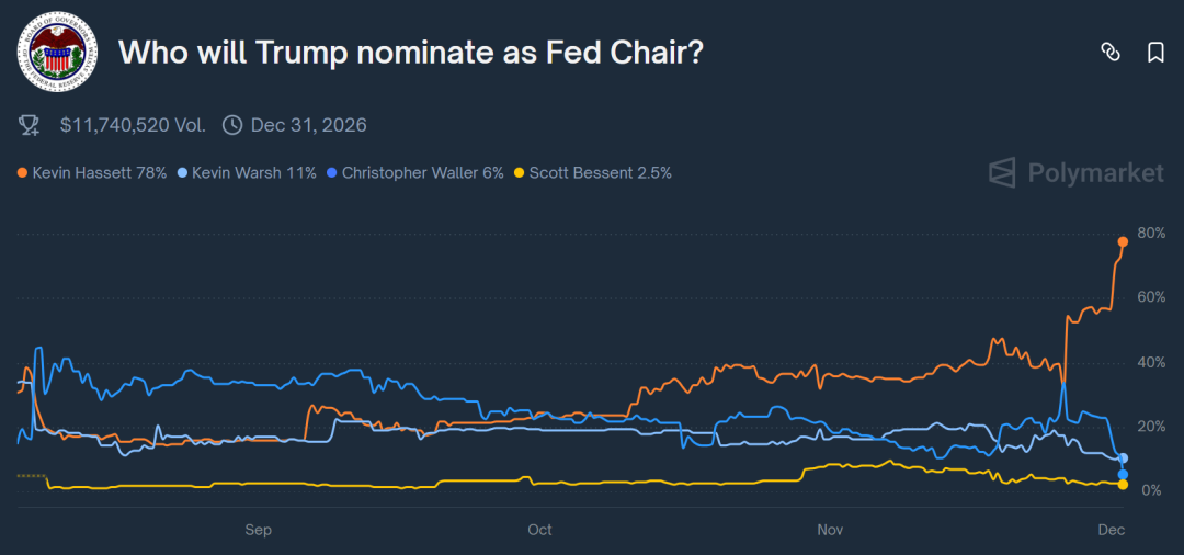 另外随着美国总统特朗普宣布已经决定下一任美联储主席提名人选,现任白宫经济委主任凯文·哈塞特已被公认为头号候补。预测市场Polymarket数据显示,哈塞特年内拿到提名的概率周一飙升至近8成——毫无疑问他是绝对的“大鸽派”。