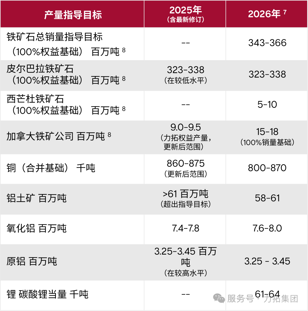 5 力拓资本份额代表我们在资本项目中的净经济投资,已根据第三方资金及资产出售收益进行调整。资本将依据集团合并原则反映于集团资产负债表,因此包含归属于非控制性权益的资本。本次发布的指导目标不包含力拓在埃斯康迪达增长项目中的份额。数据按2025年实际值计算。