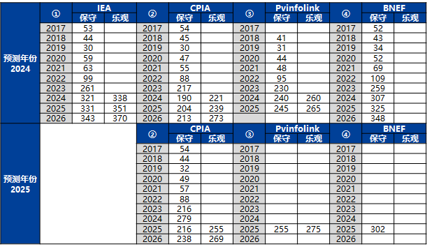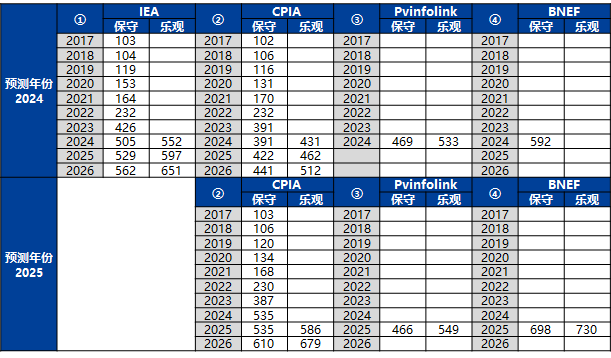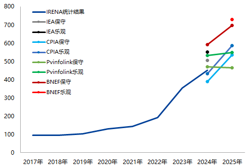 2024年全球光伏新增装机为452GW(IRENA统计,该机构对中国的新增装机统计值与我国能源局公布值一致)。在四家机构中,CPIA的乐观估计(431GW)与PVinfolink的保守估计(469GW)较为接近实际。2025年,CPIA对全球的乐观预估为586GW,PVinfolink的保守预估为466GW。