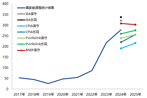根据能源局统计,2024年中国光伏新增装机容量为278GW。在四家主流机构中,PVinfolink的乐观估计(260GW)最接近实际值。该机构对2025年中国新增装机的乐观预估为275GW,与我司预估的272GW基本吻合。
