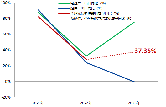 (2)2024年10月,电池片出口同比增长32.2%,组件出口同比增长24.0%。同年全球光伏新增装机容量同比增长28.0%。对比历史数据发现,2023-2024年中国出口增速与全球装机增速高度吻合,印证了中国出口对海外市场的主导地位。