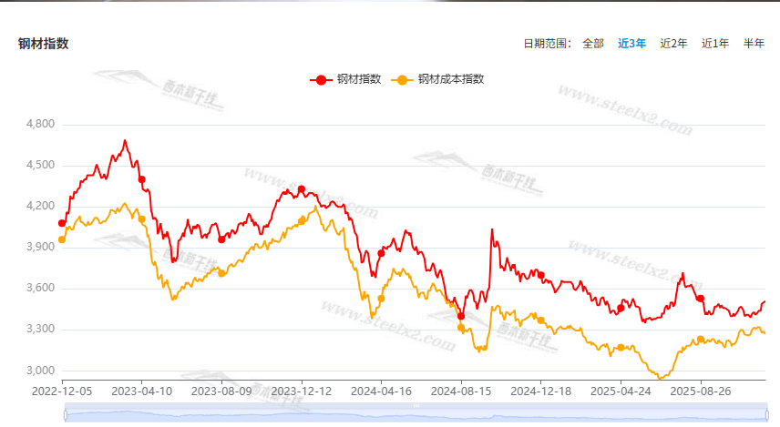 本期,全国多数市场建筑钢材价格环比回涨:其中,北方需求较弱,涨幅受限;南方现货补涨,整体抬高。本周西本钢材指数上涨,成本指数回落,显示长流程钢厂利润空间继续改善;本周螺纹钢期货主力合约换月,对现货有引导作用。(下图为红色线条为钢材指数,黄色线条为成本指数)