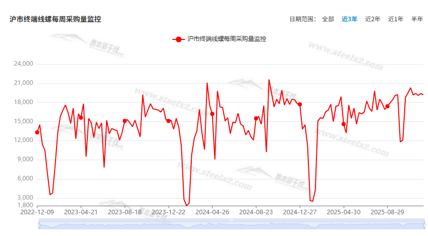本期,西本资讯监测的沪市线螺周终端采购量为1.92万吨,周环比减少1.03%(见下图)。本周终端需求环比略有下降,显示刚需无力回暖。