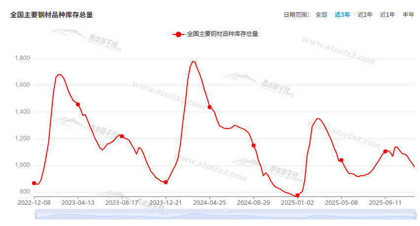 中钢协数据显示,2025年11月下旬,重点统计钢铁企业粗钢平均日产181.8万吨,日产环比下降6.4%;生铁1774万吨,平均日产177.4万吨,日产环比下降1.3%;钢材2080万吨,平均日产208.0万吨,日产环比增长8.1%。据此估算,本旬全国日产粗钢216万吨、环比下降6.4%,日产生铁209万吨、环比下降1.3%,日产钢材409万吨、环比增长3.2%。11月下旬,重点统计钢铁企业钢材库存量1428万吨,环比上一旬减少133万吨,下降8.5%;比年初增加191万吨,增长15.5%;比上月同旬减少35万吨,下降2.4%;比去年同旬增加113万吨,增长8.6%,比前年同旬增加132万吨,增长10.2%。