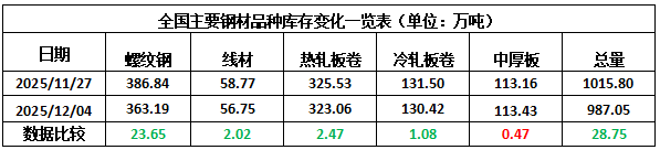 据西本资讯历史数据,当前库存总量较上年同期(2024年12月5的793.02万吨)增加194.03万吨,增幅为24.47%。分品种看,本期五大钢材品种库存中,中厚板增库,其它品种降库。(见下图)
