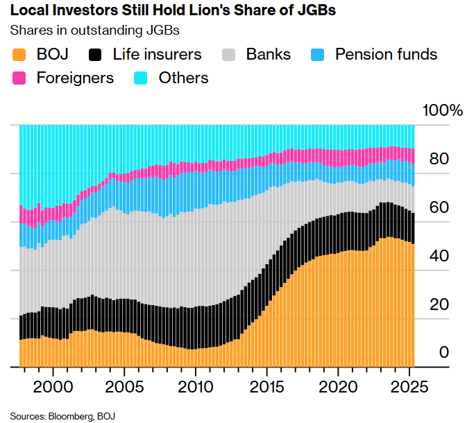 日本投资者仍然提供了快速对冲基金无法复制的稳定器:彭博社整理的央行数据显示,日本央行持有超过50%的未偿债务,国内寿险公司持有12.8%,银行持有11%,养老基金持有9.1%。与此同时,数据显示,外国人仅持有6.5%。