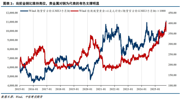 2.1、宏观端:黄金持续拉涨对铜铝等有色价格中枢形成强支撑