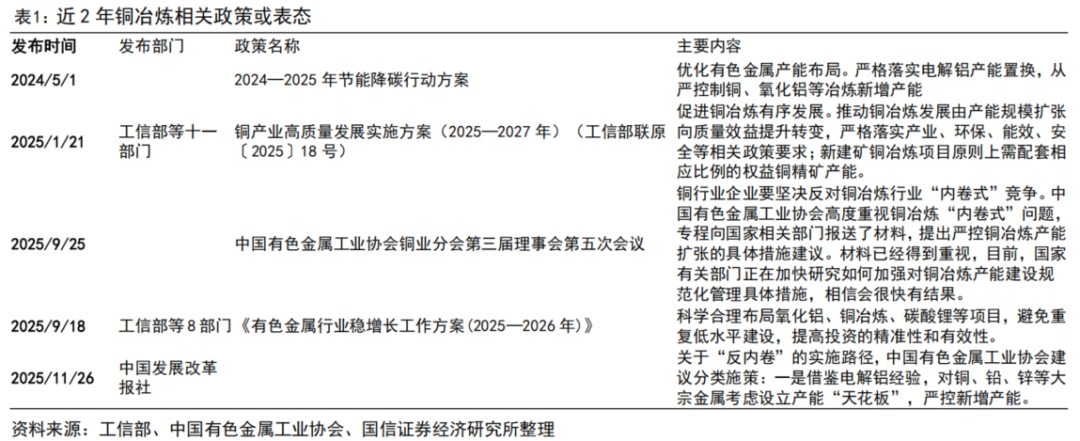 中国有色金属工业协会在11月底的Cesco会议上表示,“零或负铜精矿加工费可能严重损害全球铜冶炼企业利益,包括中国冶炼厂,这一局面挑战了长期以来的全球铜定价基准”。11月底的中国铜原料联合谈判小组(CSPT)会议宣布,鉴于铜精矿加工费持续走低,2026年度成员企业将降低矿铜产能负荷10%以上。零加工费具有很强的警示意义,可能促使相关部门出台铜冶炼行业“反内卷”措施,行业远期格局有望向好。