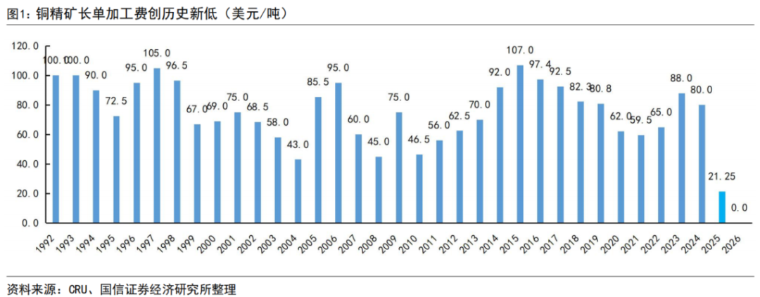 12月19日左右,智利矿业公司安托法加斯塔和国内某头部铜冶炼厂达成协议,将2026年铜精矿加工精炼费用Benchmark分别定为0美元/吨和0美分/磅,低于2025年的21.25美元/吨和2.125美分/磅。
