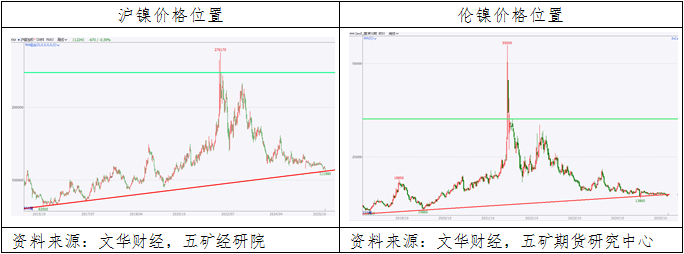 镍价处在长期价格区间低位。沪镍期货价格长期运行区间在11万-25万元/吨,伦镍期货价格长期运行区间在10000-35000美元/吨。11月28日,沪镍主力合约收盘价117080元/吨,处在长期价格区间5%分位;伦镍期货收盘价14820美元/吨,处在长期价格区间19%分位。