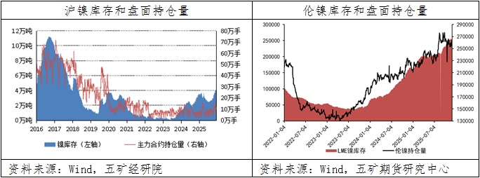 空头大幅增仓导致镍价快速下跌。沪镍盘面,11月中上旬,空头大幅增仓带动镍价明显下跌,向下试探震荡区间下沿支撑位;11月下旬,部分空头撤离带动价格反弹;12月上旬,空头再度增仓导致价格大幅下跌,跌破前期低点115450元/吨。伦镍盘面,11月上旬至中旬,空头资金主动增仓打压价格,导致镍价最低跌至14330美元/吨;11月下旬,部分抄底资金涌入叠加空头资金减仓撤退,带动镍价重新反弹至原震荡区间;12月上旬,多头减仓叠加空头增仓导致价格下跌至14000美元/吨附近。11月28日,沪镍收盘价117080元/吨,较上月同期120560元/吨下跌2.9%;伦镍收盘价14820美元/吨,较上月同期15245美元/吨下跌2.8%。
