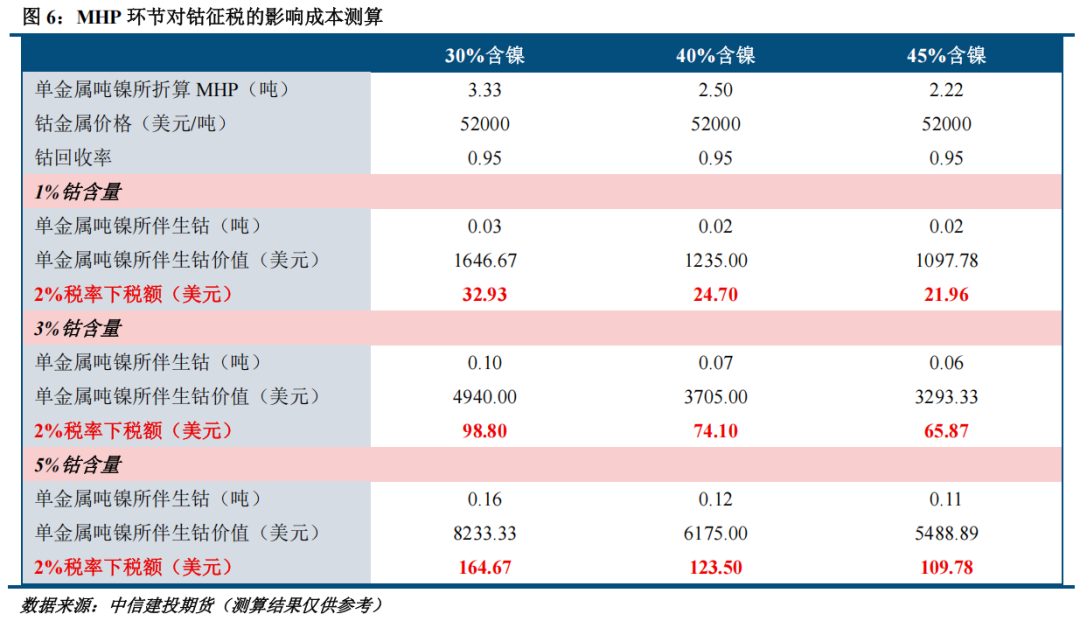 在红土镍矿HPAL工艺生产富含镍、钴的氢氧化物MHP中,通过对产成品进行浸出、净化和分离,可以实现对钴的回收,而由于钴具备较高的附加值,冶炼企业又可以实现收益抵扣。因此,对MHP生产所回收的钴进行征税,同样有可能增加企业成本负担。彭博援引APNI消息称,初步建议对中间品中的伴生钴征收2%的税率,我们对不同镍钴含量MHP的征税成本测算,结果显示单金属吨镍成本将因征税而增加成本在21.96-164.67美元不等。