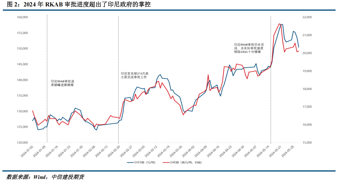 首先以2024年上半年镍价走势为例,当年年初市场消息称印尼RKAB审批速度十分缓慢,仅4家企业获得配额,一度引发市场担忧情绪。不过印尼官员随后出面表示审批工作仍在积极推进中,并表示预计将在当年3月底之前完成全部审批工作,之后随着配额不断发放,市场情绪也得到了极大缓解。但在当年5月下旬,市场消息称印尼RKAB审批工作仍未完成,且实际审批速度相较24Q1十分缓慢,情绪担忧下镍价又再度强势反弹。总而言之,印尼对RKAB审批进展的掌控失灵,背后所反映出的是其下游化愿景与行政能力的不匹配,这也更容易导致市场弱化对政策消息的敏感性。