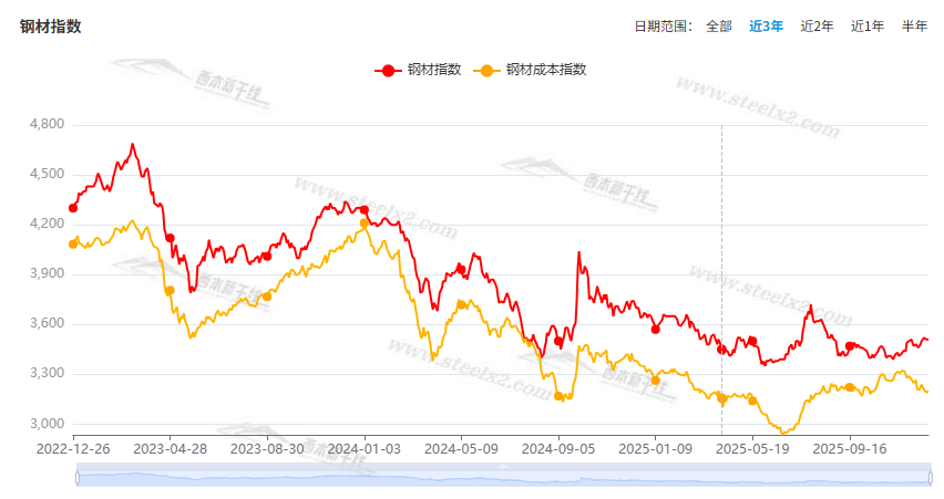 本期,全国多数市场建筑钢材价格环比变化不大:其中,北方冬储临近,钢厂稳价;南方期现联动,摇摆不定。本周西本钢材指数盘整,成本指数回落,显示长流程钢厂利润空间小幅改善;本周螺纹钢期货主力合约震荡调整,对现货有示范作用。(下图为红色线条为钢材指数,黄色线条为成本指数)