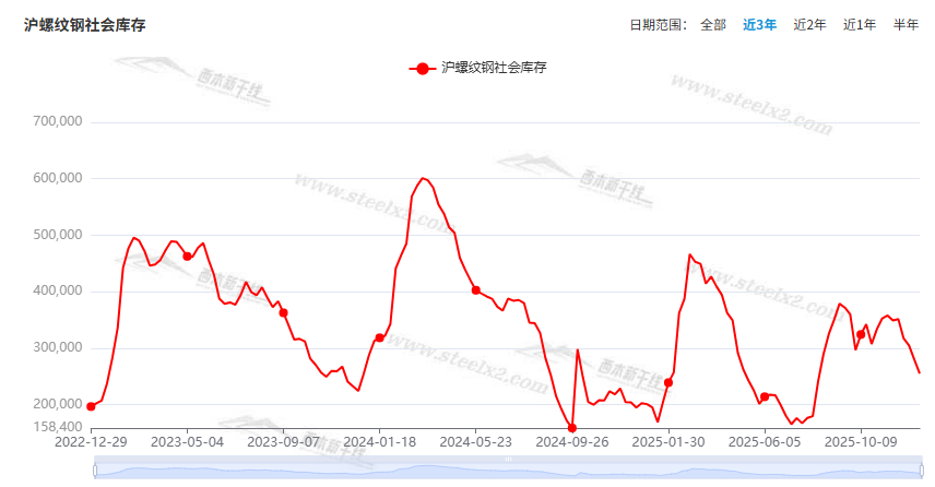 行业面上,国家发改委重申,将“持续实施粗钢产量调控,严禁违规新增产能,促进优胜劣汰”。而冶金工业规划研究院发布的2026年国内及全球钢材需求预测成果报告显示,2026年我国钢材需求量同比或有小幅下降,不同钢材品种消费量将有增有减。另据中钢协数据,12月中旬,重点钢企粗钢、生铁和钢材产量同环比均有下降,表明年末压产效应继续显现;同期企业库存环比增幅较大,意味着钢企减产的同时,库存去化速度有所放缓。展望后期,随着新一年度的来到,叠加原料价格下跌,建筑钢供应缩减的趋势料难延续,而需求端改善的概率较小,在供强需弱的预期下,建筑钢价格低位徘徊的格局或难扭转。