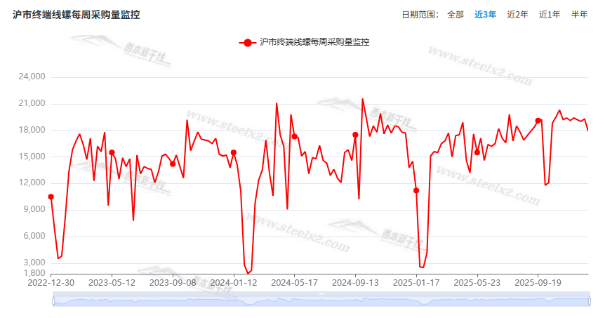本期,西本资讯监测的沪市线螺周终端采购量为1.79万吨,周环比减少7.25%(见下图)。本周终端需求环比下降,显示刚需有所放缓。