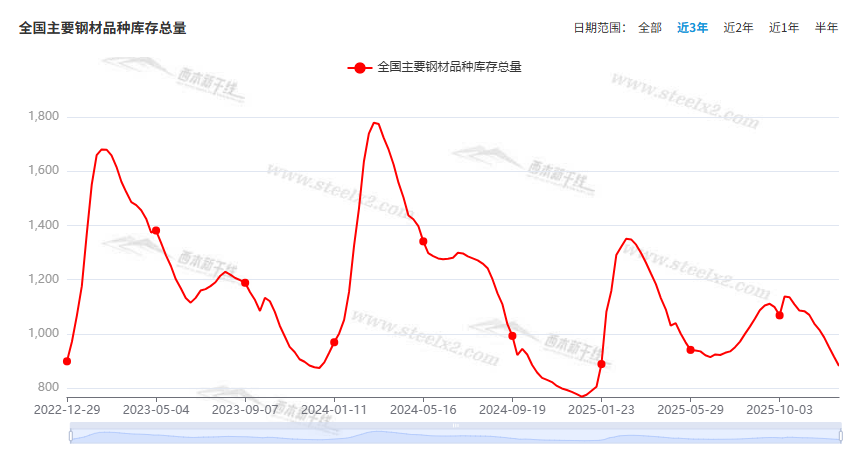中钢协:2025年12月中旬重点钢企生铁日均产量168.1万吨,旬环比下降1.9%,同比下降7.3%;粗钢日均产量184.5万吨,旬环比下降1.3%,同比下降6.7%;钢材日均产量180.3万吨,旬环比下降1.4%,同比下降8.4%。2025年12月中旬,重点钢铁企业钢材库存量为1601万吨,旬环比增加126万吨,上升8.6%;比上月同旬增加40万吨,上升2.6%;比去年同旬增加137万吨,上升9.4%。