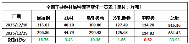 据西本资讯历史数据,当前库存总量较上年同期(2024年12月26的767.98万吨)增加113.45万吨,增幅为14.77%。分品种看,本期五大钢材品种库存中,除中厚板外,其它品种继续降库。(见下图)