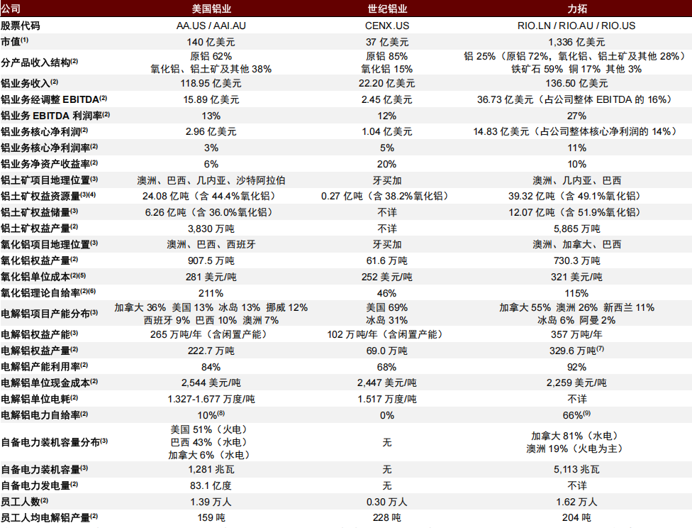 重点公司:美国铝业、世纪铝业和力拓铝业务横向对比