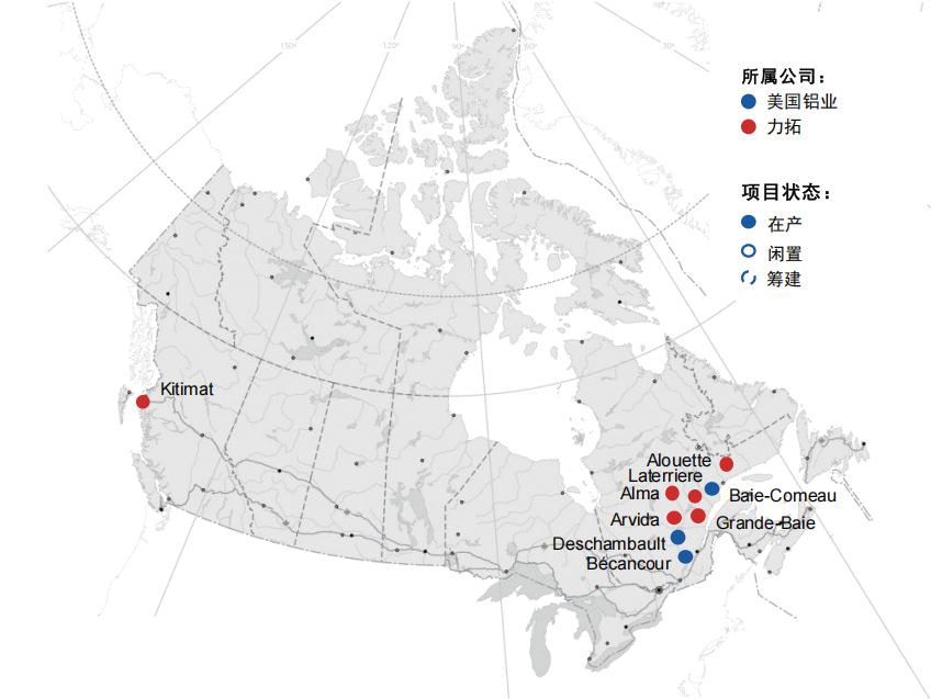 图表6:加拿大电解铝项目地理位置分布图(截至3Q25末)