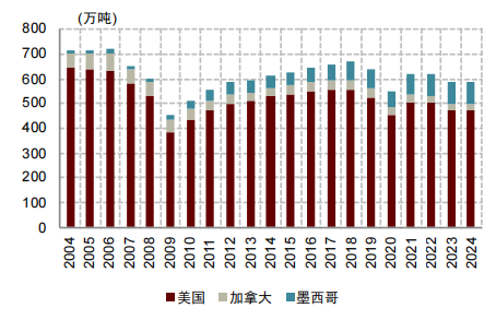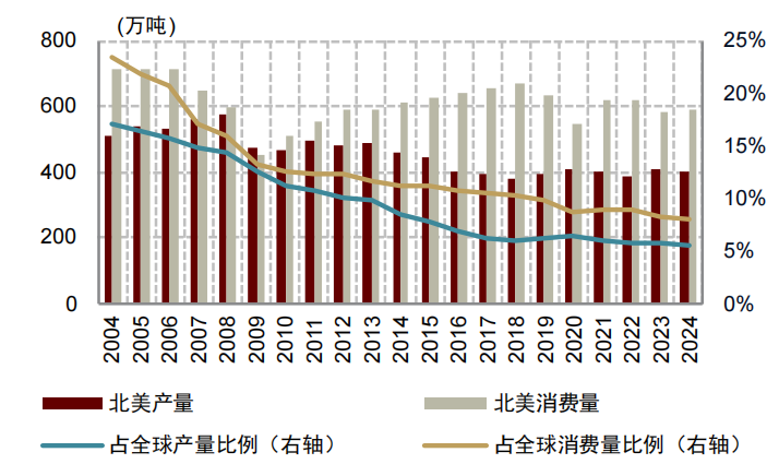 尽管市场规模近年来略有萎缩,北美仍然是全球发达国家原铝市场中的重要组成部分。北美曾是全球原铝的重要产区之一(2000年占全球产量近三成),然而近年来随着成本竞争力下滑,叠加2008年全球金融危机打击,产量整体呈稳中有降之势。自2018年美国政府宣布对进口铝产品加征232关税(并于2019年宣布对加拿大豁免)以来,北美原铝年产量在贸易壁垒的保护下企稳于400万吨左右,约占全球产量的6%。需求方面,2018年11月美墨加协定(USMCA)签署后,随着区域内产业链转移加速,美国及加拿大原铝消费量持续下滑,而墨西哥的原铝消费量在北美中的占比由2018年的11.6%稳步上升至2024年的15.4%。2024年北美原铝消费量约为589万吨,占全球原铝需求总量的8%。