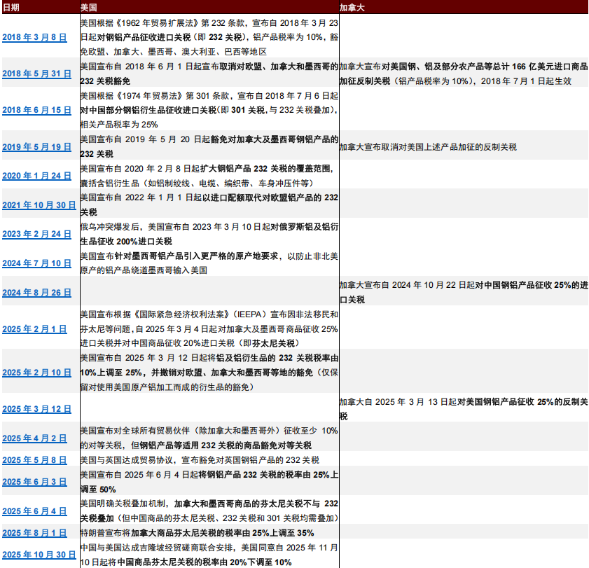 图表10:美国与加拿大铝产品关税政策主要变动(截至2025年10月)