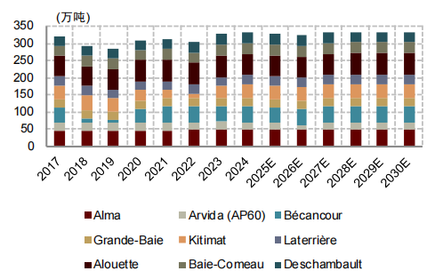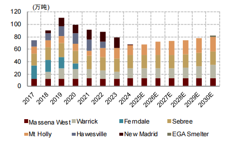 受限于电力资源制约和贸易政策的不确定性,我们认为2025-2030年北美原铝供给增量有限。美国四座在产电解铝项目中,世纪铝业的Mt Holly已宣布重启5万吨闲置产能,计划于2026年中实现满产;美国铝业的Warrick项目的5万吨闲置产能是否能够重启仍有待公司评估(重启成本或相对较高,且需时1-2年,而公司认为关税政策存在较强不确定性)。新建项目中,阿联酋全球铝业在俄克拉荷马州规划的60万吨冶炼厂的可行性研究仍在推进当中,计划最早于2030年投产;世纪铝业的Green Aluminum Smelter则仍处于选址阶段,具体产能规模和开发进展很大程度上取决于电力供应以及政策支持落地情况。加拿大方面,力拓正在推进中的Arvida AP60项目扩建主要是对旧有产能的替代,暂无其他规划中的新增产能。因此,我们预计北美原铝产量或在2024年的399万吨基础上,小幅增至2030年的416万吨(年均增速不足1%),增量主要来自闲置产能重启。