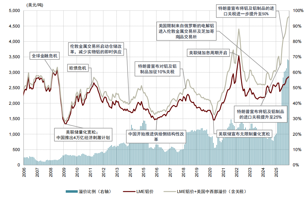 关税冲击加剧背景下,美国中西部溢价持续走扩。美国中西部溢价(US Midwest Premium)指在美国中西部地区交付的原铝相对于LME铝基准价格的溢价,其波动主要受美国当地供需、仓储物流、融资成本以及关税政策等因素影响。2012年以前,中西部溢价整体维持在不足10美分/磅的低位,主要反映当地市场的仓储与物流相关成本。2012年起,由于不断有贸易商在低利率环境下囤积铝库存并利用期货升水结构套利,叠加美国本土产能陆续关停,现货供应受限,导致中西部溢价一度突破20美分/磅,直至LME于2015年引入更为严格的强制出库规则后,中西部溢价才有所回落。2018年特朗普政府开始对铝产品征收232关税后,中西部溢价再度升至20美分/磅左右,而当232关税税率于2025年被相继上调至25%及50%后,中西部溢价幅度进一步升至80-90美分/磅(折合约1,764-1,984美元/吨),从而覆盖了关税带来的额外成本。