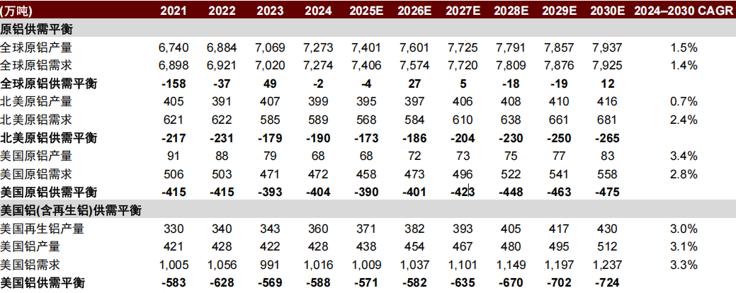 北美原铝需求有望保持较快增长,本土市场供给难以满足需求。据CRU预测,2025-2030年北美有望成为世界原铝需求增长最快的主要区域之一,未来五年年均复合增速有望达到3.7%,我们认为主要受益于特朗普再工业化战略下的制造业及交通运输业用铝量增加、建筑业复苏以及AI算力高增背景下,液冷机柜散热与输电相关设备对铝需求的拉动。由于本土产能有限且新建项目当前仍面临不确定性,短期内北美原铝产量提升空间有限,北美原铝供应或面临短缺,据CRU预测,北美地区将于2030年面临40%的原铝供给缺口。