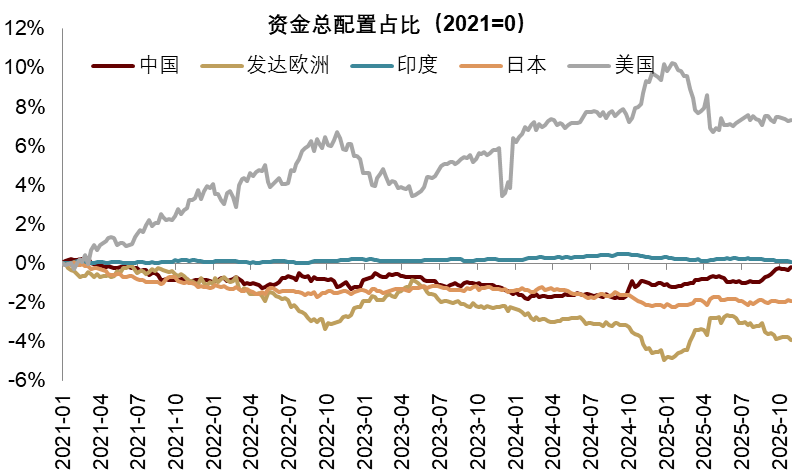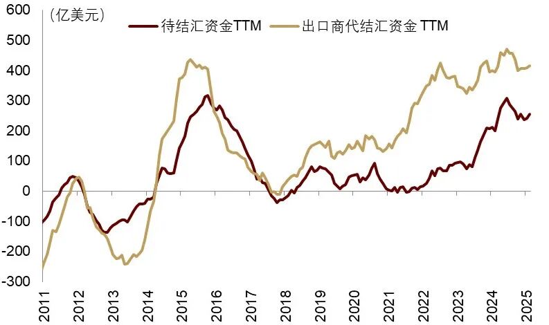 另一方面,待结汇资金回流和全球资金再平衡或支撑人民币。我们从包含经常账户和金融账户的全口径、以及仅包含出口商的窄口径两个口径测算,2020年以来,综合待结汇资金和出口商待结汇资金累计超7000亿美元和20000亿美元,均处于历史较高水平(图表26,图表27)。2025Q3以来,净结汇率从年初的-0.1回升至0附近,推动人民币升值。美元贬值预期叠加年末结汇需求上升,待结汇资金短期集中结汇或继续支撑人民币。