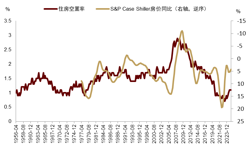 第三,地产景气偏弱。无论看开工或销售,地产市场都处在一个自2022年以来的低位,核心的问题不是需求不足而是价格太贵、贷款利率太高,使得房贷需求无法充分释放,出现“利率跌一点,房贷需求起一点”的情况(图表9)。需求无法释放,根本上存在两层原因:1)购房压力加剧,这表现在过去几年工资增速趋势下行至疫情以来低位,而同时30年期房贷利率却保持在疫情以来高位(图表10)。2)银行对房贷的审核在2008年后持续偏紧,这表现在新增房贷的信用评分持续较高,事实上,2023年以来该评分不仅没有下行反而持续走高(图表11)。与此同时,需求本身问题不大,这反映在刚需人群的房贷需求量正在触底反弹(图表12),且住房空置率持续偏低(图表13)。因此,释放需求是地产周期上行的关键,对应较为可行的路径有三个:1)通过美联储购买长久期美债(QE、收益率曲线控制YCC)压低长端利率进而降低房贷利率;2)提升工资增速,这要求财政货币共同刺激终端需求进而促进小企业雇佣;3)金融去监管,放松银行业对房贷的发放标准。
