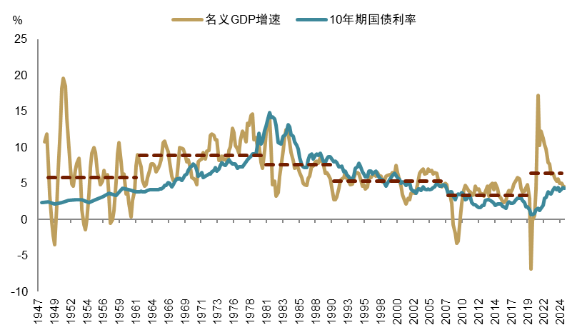 我们提示更加关注货币数量政策对扩张美元流动性和压低长端利率的影响。我们重申,在美国财政主导下(参见《特朗普“大重置”:债务化解、脱虚向实、美元贬值》),美联储此轮购债将开启货币政策常态化为财政融资(债务货币化,MMT)的先河(参见《财政主导,重启扩表》)。按照12月FOMC计划每月400亿美元的购买量,叠加财政存款的释放(预计在2026年上半年,规模在2000亿美元左右),我们估计狭义流动性将在明年上半年升至充裕(ample)水平下限以上,年末达到3.4万亿美元附近(约占GDP的10.6%,图表18)。这将产生两重影响:1)流动性有望逐渐充盈,将缓解9月以来回购市场的融资压力,稳定金融系统;2)购买短债对压制长端利率的作用有限,甚至会导致曲线陡峭化,使得长端利率易上难下,同时如果继续降息刺激经济复苏,则长端利率将随名义增速中枢而上行(图表19)。因此,我们预计,在财政主导的压力下,美联储可能继续扩大购债规模(如果想要在年末使得准备金/GDP达到充裕状态均值12.7%,或将月购债规模升至970亿美元),并拉长购债久期(比如收益率曲线控制YCC),以压制长端利率,疏解购房和企业债发行的融资压力,进而支撑AI与工业设备投资继续旺盛,并促使地产投资周期企稳回暖。