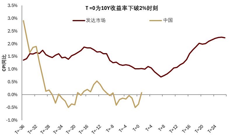 从历史可比时期来看,当前国内利率水平仍有下行空间。如果认为2%可以作为一个特殊的阈值,并把主要发达市场国家10Y利率下破2%的时间线(T0时刻)对齐作比较,会发现当前国内利率水平是偏高的。在T0时刻之前,国内利率下行节奏和发达市场历史走势基本一致,但在T0时刻之后,发达国家利率在下破2%关口之后会继续下探到1.4%附近,并维持两年左右的时间,随后开始回升(图表43)。而当前国内利率维持在1.8%附近,高于发达市场历史均值水平。进一步对比基本面因素,国内实际增长高于发达国家可比时期水平,通胀低于可比水平(图表44,图表45)。因此与国际经验相比,国内形成一种“高增长、低价格、高利率”的组合。背后是供需结构的不匹配,而偏高的利率水平可能会对需求扩张形成一定制约。在反内卷政策指引下,我们认为未来政策更多倾向需求端,利率或仍有下行空间。