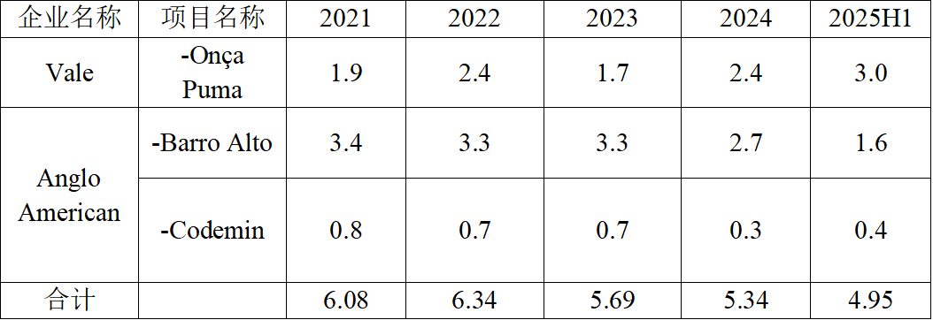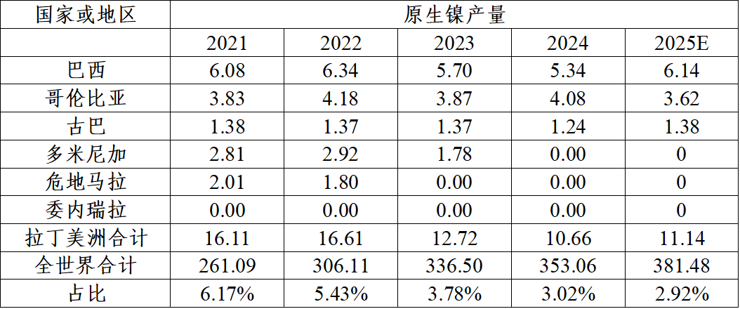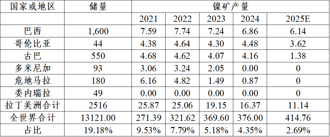 根据美国地质调查局(USGS)数据,拉丁美洲镍资源储量约为2516万金属吨,其中巴西独占逾六成,资源集中度较高。然而与较为丰沛的资源禀赋形成鲜明对比的是,该地区镍矿产量在全球的份额正快速收缩。2021-2025年,拉美总产量自25.87万金属吨预计降至11.14万金属吨,全球占比从9.53%滑落至2.69%。这一下滑趋势不仅源于印尼等新兴产区的产能爆发,更反映出拉美本土在运营、投资与政策层面的多重制约。