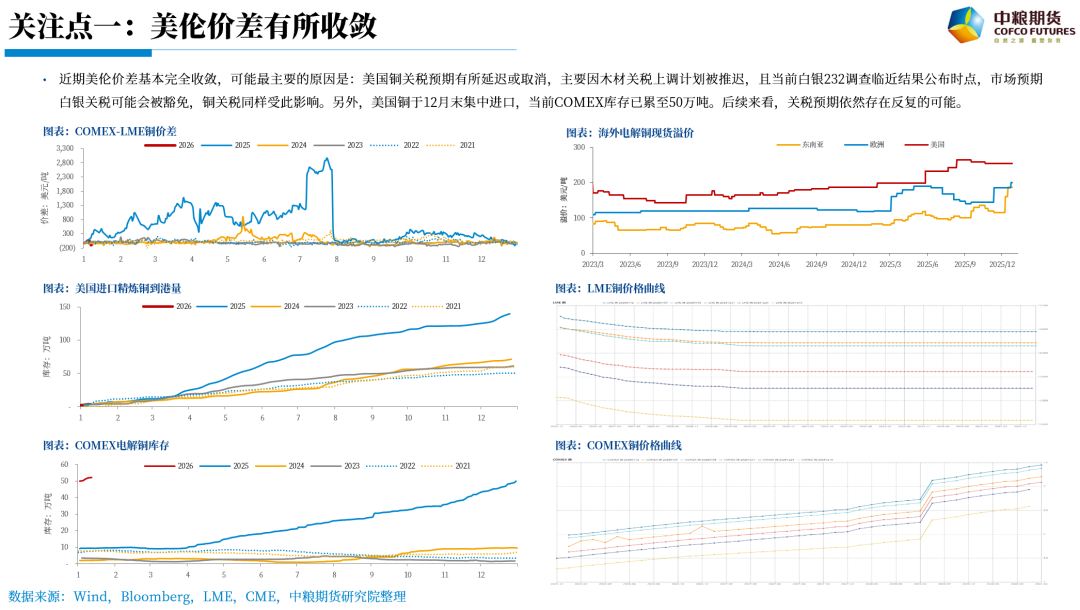 近期美伦价差基本完全收敛,可能最主要的原因是:美国铜关税预期有所延迟或取消,主要因木材关税上调计划被推迟,且当前白银232调查临近结果公布时点,市场预期白银关税可能会被豁免,铜关税同样受此影响。另外,美国铜于12月末集中进口,当前COMEX库存已累至50万吨。后续来看,关税预期依然存在反复的可能。