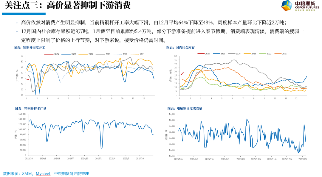 高价依然对消费产生明显抑制,当前精铜杆开工率大幅下滑,由12月平均64%下降至48%,周度样本产量环比下降近2万吨;