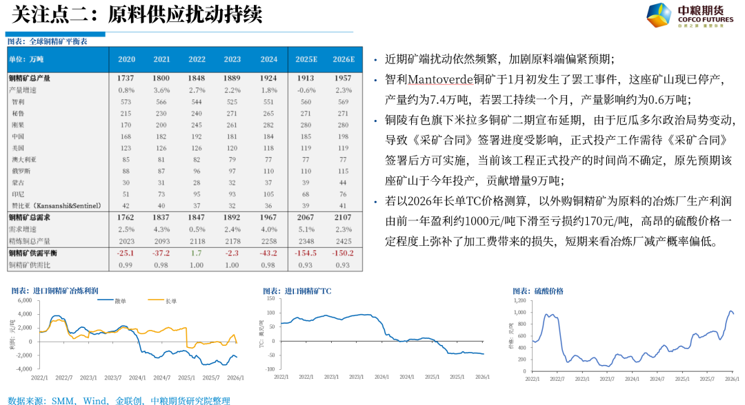 若以2026年长单TC价格测算,以外购铜精矿为原料的冶炼厂生产利润由前一年盈利约1000元/吨下滑至亏损约170元/吨,高昂的硫酸价格一定程度上弥补了加工费带来的损失,短期来看冶炼厂减产概率偏低。