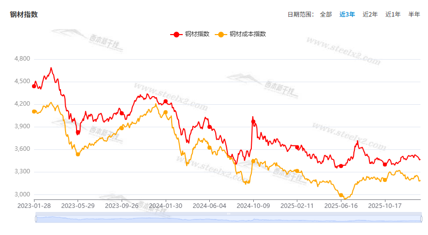 本期,全国多数市场建筑钢材价格稳中有落:其中,北方需求更少,钢厂稳价;南方成交转弱,震荡调低。本周西本钢材指数小跌,成本指数下移,显示长流程钢厂利润空间尚未压缩;本周螺纹钢期货主力合约波区间波动,对现货无提振作用。(下图为红色线条为钢材指数,黄色线条为成本指数)