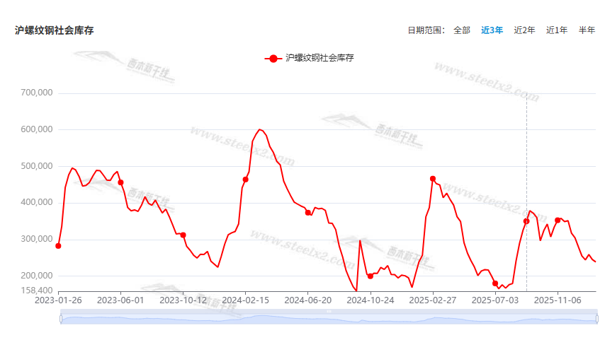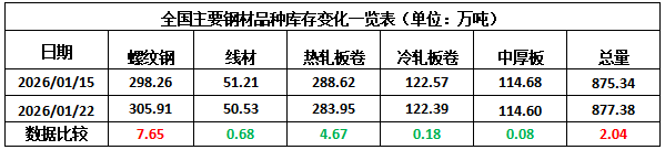 据西本资讯历史数据,当前库存总量较上年同期(2025年1月23日的888.46万吨)减少11.08万吨,降幅为1.25%。分品种看,本期五大钢材品种库存中,除螺纹外,其它品种库存下降。(见下图)
