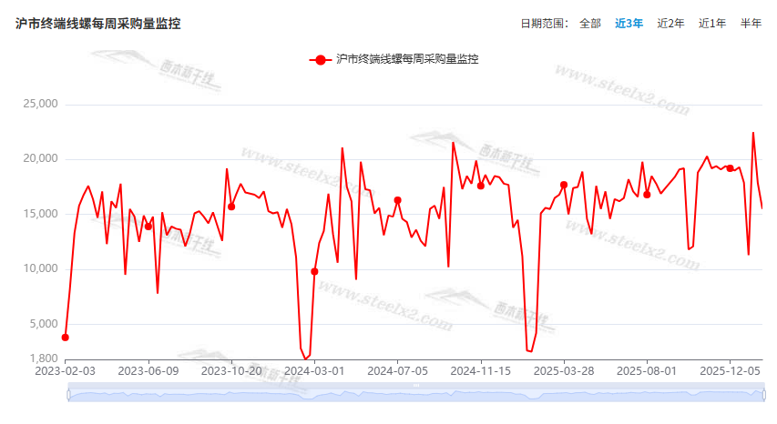 本期,西本资讯监测的沪市线螺周终端采购量为1.55万吨,周环比下降13.17%(见下图)。本周终端需求环比继续减少,显示需求逐步进入“假前状态”。