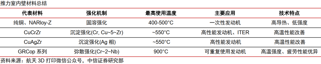 1)高强高导铜合金:推力室内壁“第一梯队”材料。液体火箭发动机燃烧室内部燃气温度达3000-4000℃,内壁材料需在约540℃以下工作,对材料提出“高导热+高温强度+抗疲劳”的矛盾要求,因此内衬材料逐步升级为沉淀强化的CuCrZr合金,以及弥散强化的新一代CuCrNb合金(对标NASA GRCop系列)。