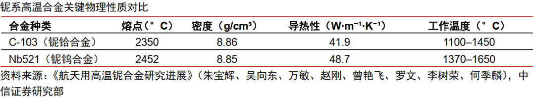 2)铌合金:二级火箭真空喷管与高工况推力室的主力材料。适合制造形状复杂的航天发动机关键部件,特别是二级火箭真空喷管和高工况推力室,其中C-103(铌铪合金)和Nb521(铌钨合金)已成为主力牌号。SpaceX的Merlin真空版喷管延伸段已大量采用C-103,证明了其在可复用商业火箭中的工程可行性。