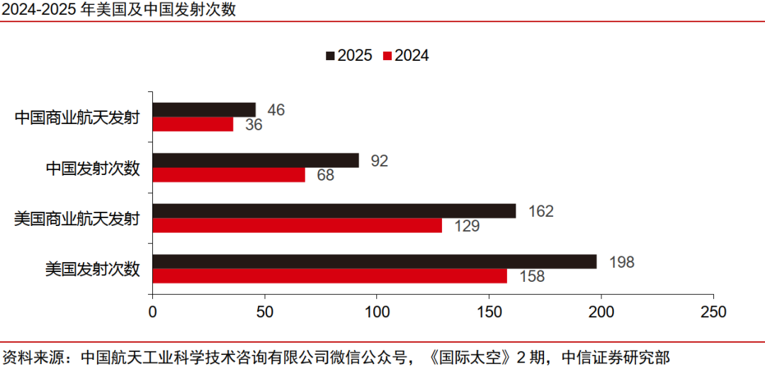 2025年全球火箭发射329次,其中商业航天发射214次,占比约65%;中国发射92次,商业航天占比50%;美国发射198次,商业航天占比82%,商业属性已成为行业增长的主要驱动力。在星座端,我国近期新增申报低轨卫星20.3万颗,叠加原有项目,申报总数已突破25.5万颗。在ITU“7-9-12-14年”强制发射约束下,高密度发射窗口效应将把火箭与卫星制造推入“刚性放量”的轨道。