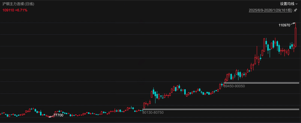 1月29日沪铜大涨,主力合约盘中突破11万元/吨,截至收盘,主力合约CU2603日内涨幅约6.71%。