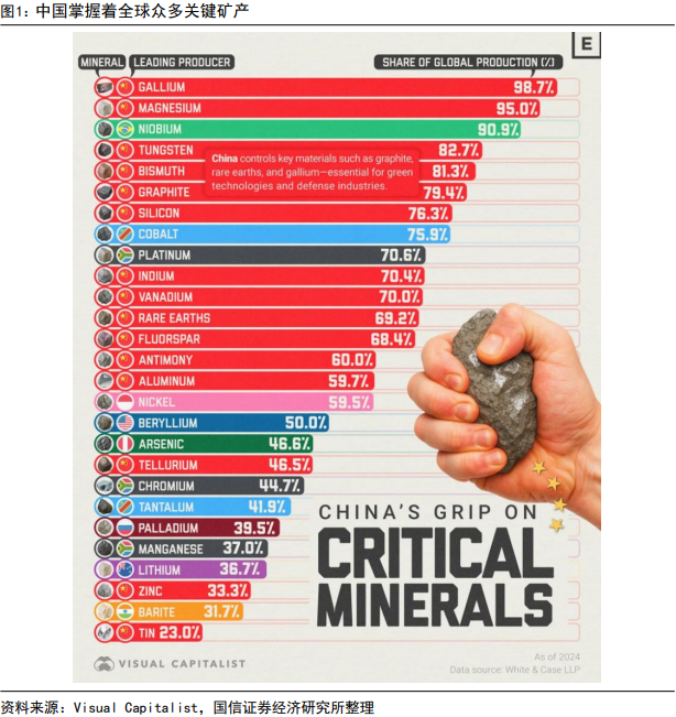 关键矿产研究至关重要:1)中国可以通过战略矿产的出口限制政策来反制西方国家。中国有丰富的矿产资源储量,尤其是在多种稀有金属领域有绝对明显优势,比如钨(全球占比82.7%)和稀土(全球占比69.2%),中国还掌握着这些关键矿产大部分的冶炼产能,比如中国的稀土冶炼全球占比达到约90%。中国目前对多种关键矿产实施严格的出口管制。2)美国拟通过高关税保护来创造市场条件,构建矿产资源安全。美国地质调查局数据显示,美国12种关键矿产完全依赖进口,29种关键矿产进口依赖度超过50%,其从中国至少进口29种矿产资源,凸显了其供应链的脆弱性。目前美国政府对关键矿产供应链实施全方位介入。比如在2025年7月,美国国防部向美国稀土生产商MP Materials投资4亿美元,使其拥有15%股份,以资助其建设大型稀土磁体新工厂;在2026年2月,彭博社消息,美国计划启动一项战略性关键矿产储备,初始资金为120亿美元。3)全球地缘政治风险频发,资源输出国逐步收紧资源政策。对于那些掌握着关键矿产的国家而言,通过政策工具强化对供应节奏的控制,实质上是在争夺全球关键矿产定价主导权。以刚果(金)为例,刚果(金)钴产量约占全球总产量76%,为应对钴价长期低迷的格局,刚果(金)于2025年实施长时间的钴原料出口禁令,并于2025年10月16日改为实行出口配额制度。4)资本加速涌入关键矿产链条,吸金效应显著。在宏观不确定性中,资本市场加大了对关键矿产板块的配置,表达对关键矿产战略价值及资源品安全逻辑的深度锚定。