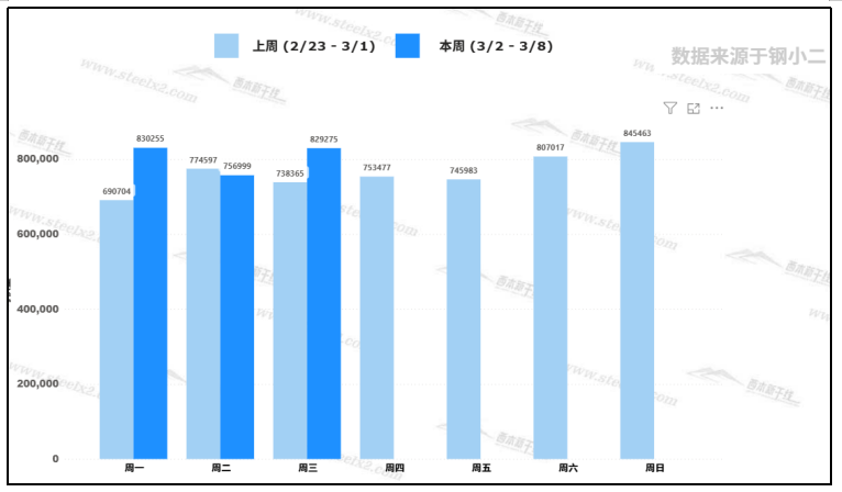 据钢小二平台样本数据,3月4日建筑钢材社会库存量为829,275吨,较上个交易日库存增加9%。