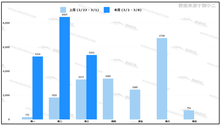 据钢小二平台样本数据,3月4日采样全国工程需求量为5352吨,较上个交易日下降37%。